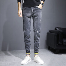 新品夏季薄款破洞九分裤男修身牛仔裤冰丝轻薄小脚裤弹力裤脚织带拼色紧身铅笔裤磨破轻薄窄脚裤新款休闲百搭 黑色 33(2尺6)