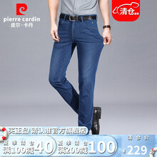 皮尔卡丹氨纶针织男士牛仔裤男 夏季新款轻薄透气修身直筒长裤中青年商务休闲微弹裤子 牛仔蓝 29码