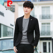 皮尔卡丹休闲西服外套男士小西装套装修身夏季轻薄款单件上衣韩版潮流帅气针织 黑色单件西服 M
