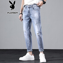 花花公子男装破洞牛仔裤男士九分裤夏季薄款新品弹力轻薄透气休闲男裤夏天9分裤时尚修身小脚裤子 浅蓝色 28码=腰围2尺1