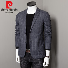 皮尔卡丹亚麻西服男修身韩版潮流轻薄条纹做旧春季棉麻单西外套男士小西装针织 HX19019灰色 170M