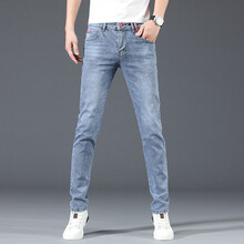 2021年夏季薄款冰丝牛仔裤男修身小脚裤韩版显瘦紧身裤百搭水洗浅蓝色拼色铅笔裤小窄脚裤轻薄长裤新款 浅蓝色 33码