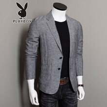 花花公子亚麻西装男休闲商务单西上衣春季轻薄修身韩版潮流棉麻小西服外套 10617灰色 M