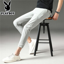花花公子冰丝休闲裤男九分长裤夏季轻薄款抽绳弹力修身拼接小脚男裤子 灰色 M