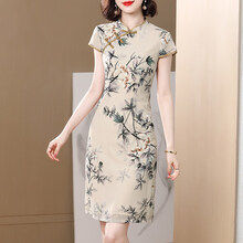 QIYUN轻奢品牌高端女装 旗袍连衣裙2021年新款夏天修身雪纺短袖裙子女年轻款中国风改良版旗袍 杏色 M
