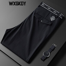 WXQKDY潮牌轻奢休闲裤男 夏季新款男士刺绣轻商务修身小直筒裤男潮流青年轻薄透气速干黑色西装裤男装 黑 29