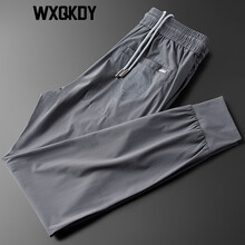 WXQKDY潮牌轻奢男装 夏季薄款男士冰丝滑料垂感高弹力运动长裤男潮流印花轻薄透气修身束脚休闲裤男 灰 30
