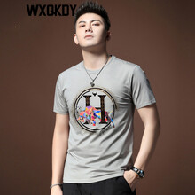 WXQKDY潮牌轻奢短袖T恤男 夏季新品男士修身圆领烫钻印花休闲半袖上衣男时尚青年轻薄透气短袖T恤男 灰色 M