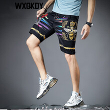 WXQKDY潮牌轻奢男士虎头印花五分裤男 夏季新品青年个性轻薄修身休闲短裤男潮流小蜜蜂印花沙滩裤男装 黑色 28