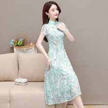 改良旗袍裙夏装2021年新款女修身气质中长款显瘦妈妈装印花连衣裙6.29 绿色 M