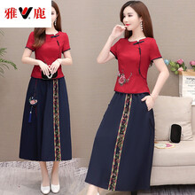 中年刺绣改良版旗袍连衣裙两件套妈妈装复古显瘦气质汉服套装裙子轻奢韩版显瘦时尚女装 红色 短袖旗开得胜送考服妈妈穿 2XL旗开得胜送考服妈妈...