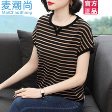 麦潮尚t恤女夏季2021新款圆领条纹短袖T恤宽松体恤中老年妈妈装大码上衣小衫新品女装潮F5 杏黑条纹 M