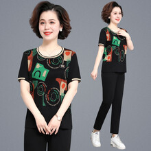 中老年夏季新款休闲运动套装女夏装两件套大码宽松妈妈装印花圆领短袖T恤长裤跑步晨练运动服女装 黑色【短袖长裤】夏装*两件套 XXL【建议体重113-...