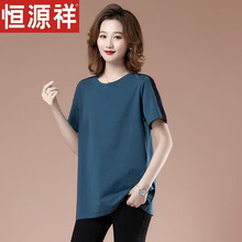 恒源祥【精选品质】女装高端轻奢2021年新品女宽松胖半袖m遮肚小衫50岁妈妈夏装中长款棉短袖T恤新款 灰蓝色短袖 L