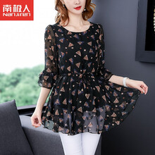 南极人高档品牌女装 雪纺衫女上衣中长款2021夏季碎花新款遮肚子荷叶袖显瘦五分妈妈装 黑色 M