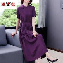 雅鹿 旗袍式醋酸连衣裙女夏2021新款大码女装紫色优雅妈妈气质中长裙子轻奢韩版显瘦时尚女装 紫色 L