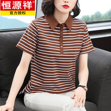 恒源祥【特价捡漏】纯棉短袖T恤女夏装新款中老年妈妈翻领条纹大码半袖上衣polo 咖啡色 L
