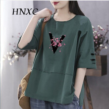 HNXC支持!国产鸿·星尔克纯棉夏装中年女士洋气破洞夏天宽松大码妈妈装T恤女上衣小衫 307 V花绿色 M 建议80-100斤
