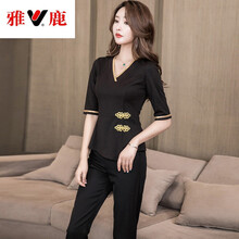 雅鹿 技师工衣足浴女2021新款秋冬季遮肚显瘦足疗店沐足工作服长裤套装工作服定制 mj805 中袖 裤装 黑色 S
