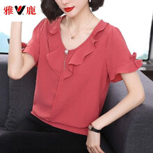雅鹿 品牌大码宽松妈妈短袖女2021新款高端小衫洋气遮肚子显瘦上衣女时尚简约显瘦洋气女装 西瓜红官方旗舰 4XL官方旗舰