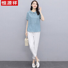 恒源祥【精选品质】21年T恤女套装棉麻套装夏季新款洋气减龄休闲气质九分裤裤装两潮旗舰官方店特价上新 兰色上衣+白色库子(套 XL建议116-130斤