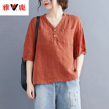 雅鹿 品牌小衫棉麻宽松洋气短袖亚麻气质新款v领女装上衣高端减龄T恤女高端大码时尚简约显瘦女装 桔红 M