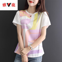 雅鹿 2021春夏新款印花雪纺上衣女撞色绸缎宽松薄款短袖圆领针织T恤衫 粉色 M