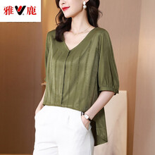 雅鹿 品牌2021年新款夏季短袖雪纺高端真丝洋气上衣女妈妈夏装减龄小衫时尚简约显瘦洋气女装 绿色官方旗舰 M官方旗舰