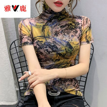 雅鹿 特价捡漏 雅鹿 高领网纱短袖t恤女春秋薄款紧身纱网内搭打底衫性感半袖蕾丝上衣 图片色 M