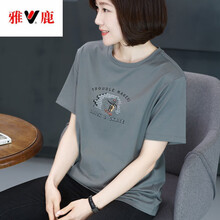 雅鹿 轻奢品牌女士夏装女装洋气休闲短袖2021夏装棉圆领印花宽松短袖色棉打底衫半袖上衣服t恤女装高 中灰(偏大一码数) M