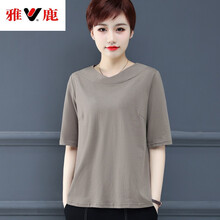 雅鹿 夏装女士T恤上衣短袖2021年新款中年妈妈V领中袖宽松半袖棉t桖透气舒适显瘦国货之光t恤 杏色 XXL