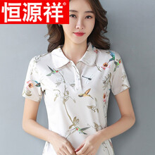 恒源祥【捡漏特价】新款中国风印花短袖T恤中年女士年轻妈妈翻领半袖上衣优选真品牌优选丝 米白色 7XL