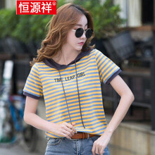 恒源祥品质女装 条纹T恤女条纹有带帽衫女夏短袖恤薄款宽松时尚大码韩版连帽半袖上衣 黄蓝条灰帽 M