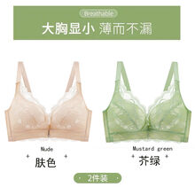 金欧达新品内衣女无钢圈薄款洞洞杯夏季内衣女士款洞洞杯大胸显小透气大码性感聚拢文胸罩防下垂 肤色+芥绿【2件装】 42/95B