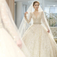品牌新娘长袖气质法式主婚纱2021新款小个子仙梦幻森系拖尾礼服星空 齐地款 S