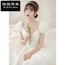 抖音缎面主婚纱2021新款夏季新娘气质公主风拖尾轻纱法式婚礼简约 象牙白齐地 S
