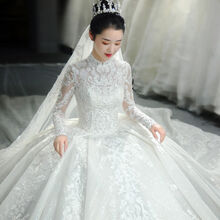 宫廷重工主婚纱立领2020新款冬季气质大拖尾长袖婚纱森系超仙梦幻简约小个子 齐地款 L