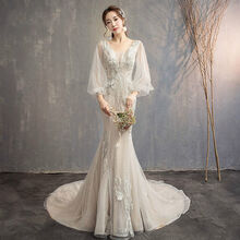 网纱鱼尾绣花朵婚纱2020新款新娘结婚礼服主纱森系出门纱韩式小拖尾冬季长袖 托尾款 XS