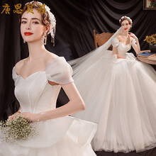 孕妇高腰遮肚婚纱天使的嫁衣宛若公主时髦范儿法式一字肩新娘婚纱礼服批发 白色 XXXL