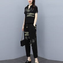 穆夏百合时尚休闲运动套装女上衣两件套套装裤子2021夏装新款夏季女装宽松休闲裤女束脚裤卫裤九分裤 黑色 XL(建议117-130斤)