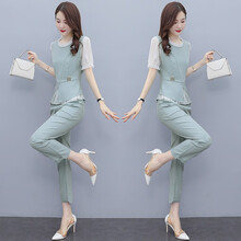 唏旸女装套装小香风时尚套装女2021新款夏季休闲气质女装轻熟风小个子套裤 绿色 L【建议96-105斤】