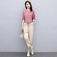 澄康高档21年夏季新款时尚休闲棉麻套装女洋气减龄气质显高小个子两 豆沙红+米白 XL