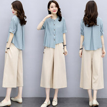 雁皇YESHON品牌夏天裙裤棉麻套装女2021年夏季新款女装遮肉显瘦亚麻七分裤套装 蓝+米白 M