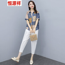 恒源祥【品牌女装】专柜轻奢大牌女装2021新款棉麻套装女夏装新款洋气减龄印花时尚休闲小个子两潮 蓝色 M (建议95-105斤)