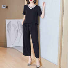 高档轻奢品牌女套装夏两件套套装宽松大码阔脚裤时尚休闲V领短袖雪纺上衣薄款夏季透气显瘦女装 黑色 XL【适合125-135斤】