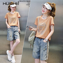 HUISHI卉饰 香港潮牌休闲时尚套装女夏季2021年新款牛仔短裤五分裤洋气减龄薄款两件套 卡其色 M
