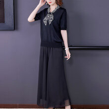 恒潮奢华高端阔太太两夏装遮肚套装时尚洋气年轻妈妈气质上衣阔腿裤裙长款 图片色 大码L