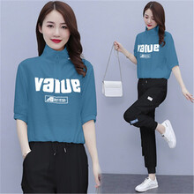 柏诺雅休闲裤时尚减龄夏装搭配套装女2021年新款洋气休闲夏季网红运动服套装 蓝衣+黑裤 XL