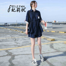 妃莉杋 连衣裙女夏季21年女装套装新款韩版时尚休闲显瘦宽松衬衫阔腿短裙裤小个子洋气减龄两件套套装裙 藏青色套装 2XL