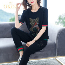 OKOJ品牌冰丝针织运动套装女夏季短袖洋气小熊运动服显瘦小脚裤休闲两件套 黑色 L定金拍下补尾款